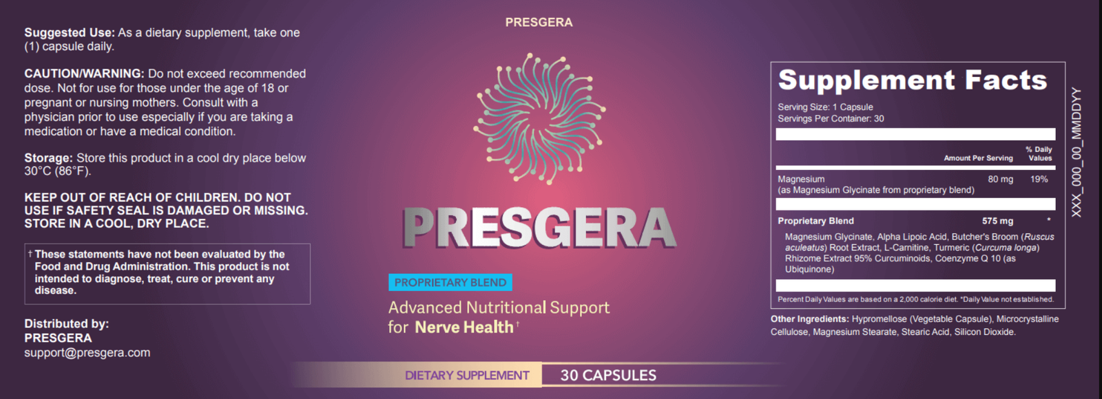 Presgera™ is a clinically developed nerve-support formula, created to neutralize the inflammatory “Pаіп Mоlесulе” responsible for burning, tingling, numbness, and electric-shock sensations.